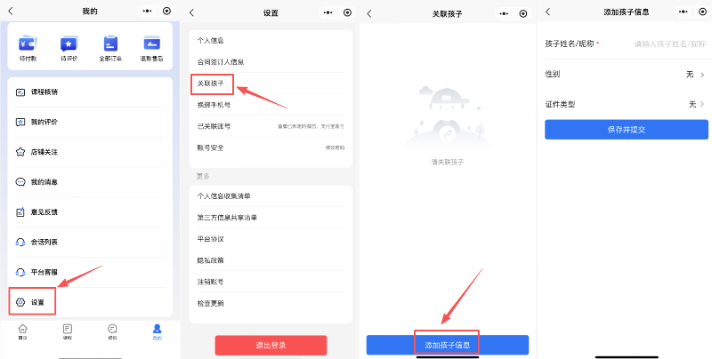 如需購買課程,需要先關聯孩子信息,依次點擊“我的”→“設置”→“關聯孩子”→“添加孩子信息”→輸入孩子姓名(必填);選擇性別、證件(選填)→點擊“保存并提交”。若使用微信“掃一掃”購課,但是機構未開通“微信支付”功能,會顯示【機構未開通微信支付】,家長可使用支付寶“掃一掃”或通過全國平臺APP購課。