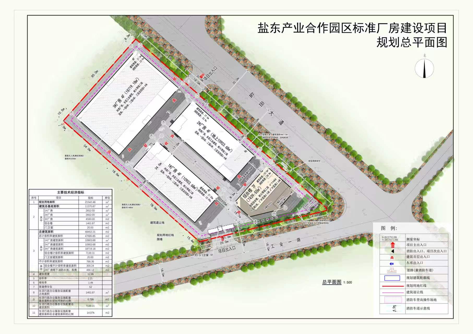 項目位于東源縣鹽(田)東(源)共建現(xiàn)代物流園工業(yè)大道以東、工業(yè)一路以北XT-02-13地塊,用地面積共21543.46平方米,用地性質(zhì)為工業(yè)用地,建設(shè)單位為東源縣鹽東產(chǎn)業(yè)投資發(fā)展有限公司。項目擬建設(shè)三棟四層丙類廠房,一棟七層綜合樓(一層為廚房、飯?zhí)谩⒓芸諏樱⑷龑訛檗k公區(qū),四至七層為宿舍),沿工業(yè)一路及鹽田大道設(shè)置主要出入口。方案主要經(jīng)濟技術(shù)指標(biāo)為:總建筑面積共48452.21平方米(其中計容建筑面積為47986.09平方米、不計容建筑面積為466.12平方米),容積率為2.23,建筑密度為52.8%,綠地率為1.4%。