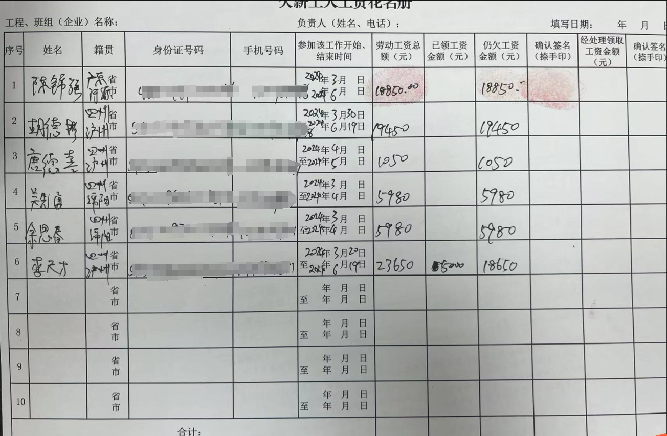 經調查:你單位在東源縣經營用工期間存在拖欠陳錦強等6名勞動者自2024年3月至6月勞動報酬共計69960元(詳見附件);